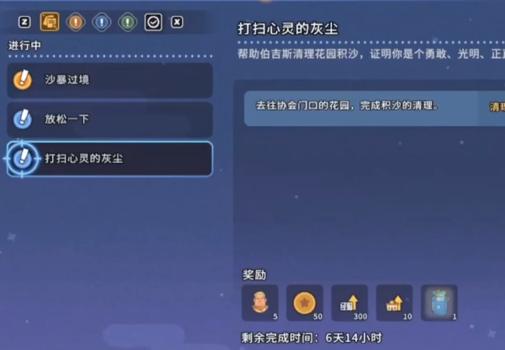 其二为任务执行:商会每日刷新的委托任务中,“清理花园沙堆”为固定常驻条目。接取后需前往镇门口指定区域,可见覆盖面积约3×3格的散落沙粒。使用鸡毛掸子连续挥扫3次即可完成清理,任务结算将发放金币、经验及协会贡献值。该操作无失败判定,亦不消耗耐久度,是前期快速积累资源的高效途径。