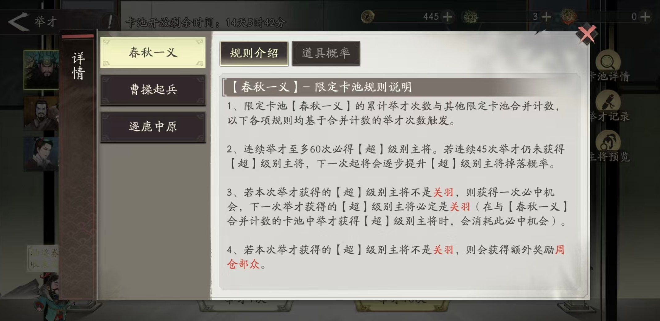 针对限定卡池,游戏还引入了独特的进阶保底机制。此机制并非保障超品质主将的出现,而是确保限定角色的获取。具体规则为:若玩家在限定池中首次获得的超品质主将并非本期限定人物,则系统将记录此次结果,并赋予下一次获取超品质主将时必得限定角色的机会。这一设定有效降低了非目标出货带来的挫败感,增强了玩家抽取限定武将的信心。