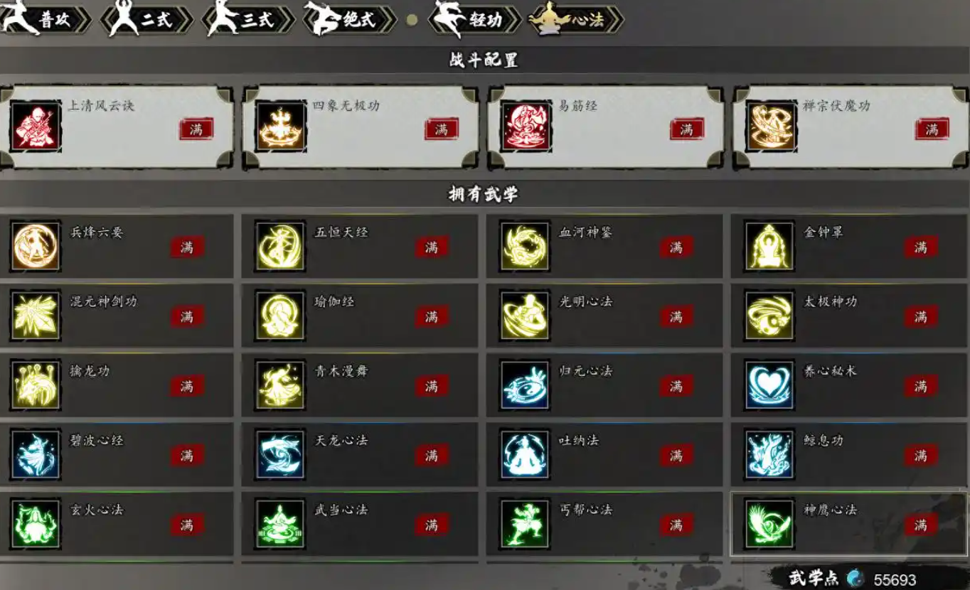 太极神功为剧情强制解锁心法,无需额外条件。当主线推进至清虚道长相关章节时,该NPC将主动赠予此心法,且全队角色均可修习,属早期泛用性最强的基础增益心法。紧随其后的是易筋经,获取方式为抵达少林寺后向圆悟禅师请教。该心法具备双重实战价值:一是即时清除全部负面状态,二是永久提升气息上限,显著增强角色在持续作战中的容错率与续航稳定性。