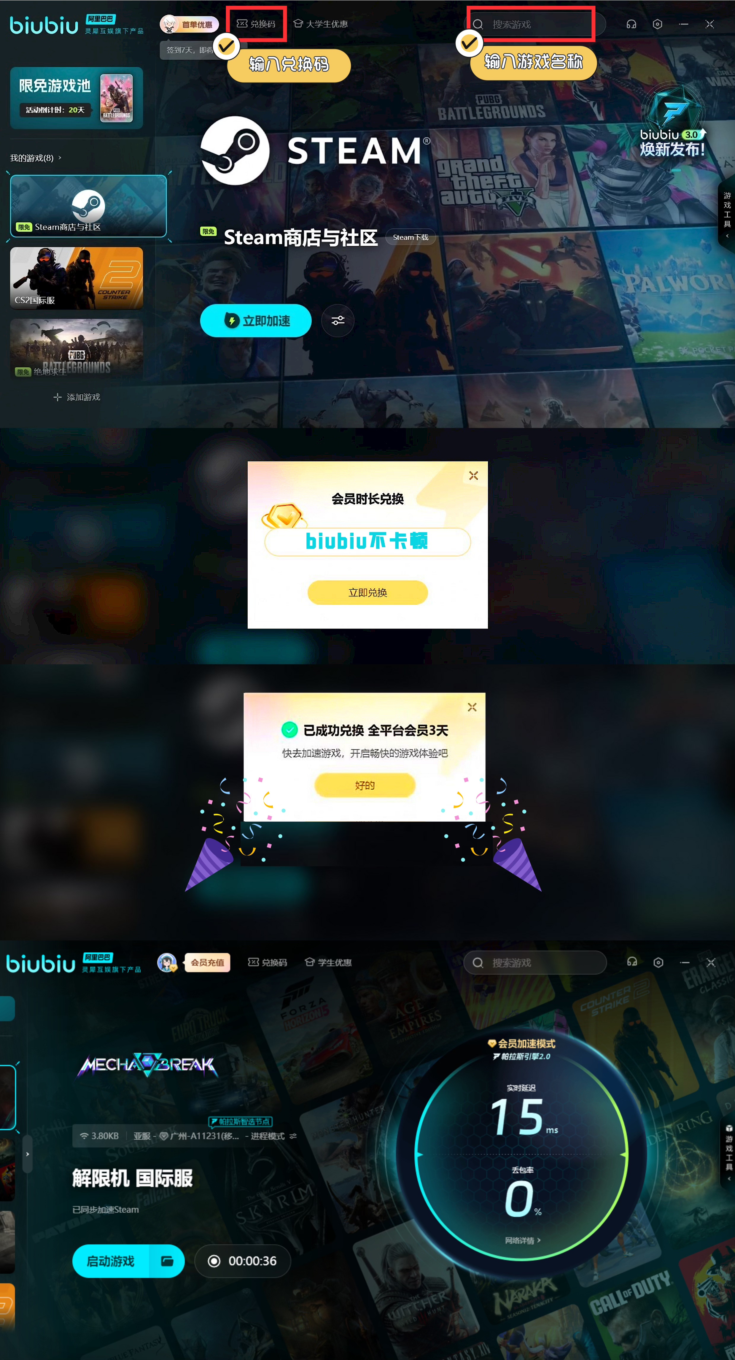 不过要是大家想要先体验一下的话,新人可以领取3小时的免费加速,令你先进入看一下该大作是否适合自己玩。然后新老用户输入【biubiu不卡顿】,可额外领取三天免费加速,如此就能继续提升个人等级,并在机甲战场中斩杀更多强敌。