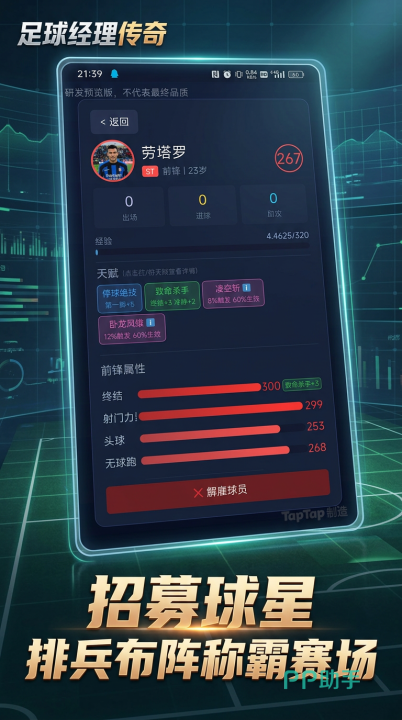 本作的核心体验围绕“真实足球管理”展开:玩家需自主完成球员招募、合同谈判、位置适配、阵型设计、临场换人及赛季规划等全流程操作。区别于传统卡牌式足球游戏,本作不设强制抽卡机制,所有球员均可通过自由转会、梯队提拔或自由签约方式获取,阵容构建完全取决于玩家的战术构想与资源调配能力。