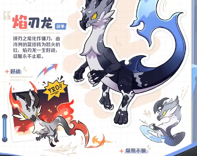 官方为其标注的性格关键词包括:一生好战、征服欲强、永不退缩、桀骜不驯。这些标签精准描绘出一个典型的战斗狂形象。无论面对多么强大的敌人,焰刃龙都不会选择回避,反而会因挑战而兴奋。这种宁折不弯的气质贯穿于角色设定之中。配合游戏中出现的精灵日记片段,寥寥数语便勾勒出一段深陷杀戮轮回却奋力挣脱命运桎梏的过往。正是这样的背景铺垫,让整个角色显得更加立体且富有故事性。