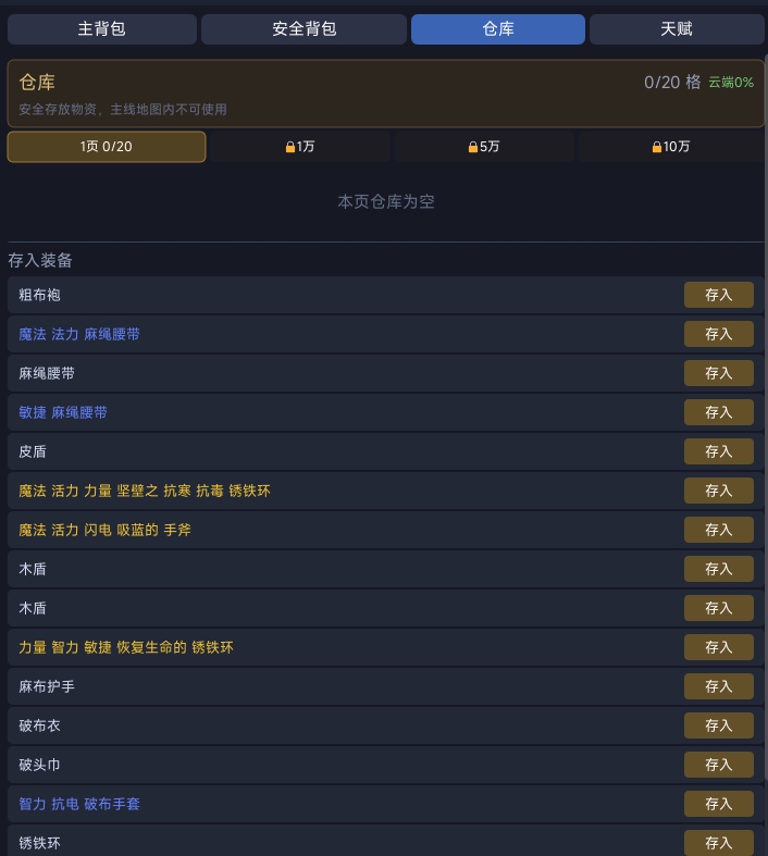 需特别注意:仅当携带物资成功撤离至关卡出口,所获物品才正式归属账号。若在关卡内阵亡,除已存入安全背包的物品外,其余全部遗落原地。安全背包为唯一保底机制,支持随时存取,建议在拾取稀有品质(如传说、神话)装备或高价值材料后立即转移。此外,强烈推荐在主城仓库预置至少两套完整备用装备,确保因撤离失败导致全装丢失后,仍能快速重返战场,避免成长断层。