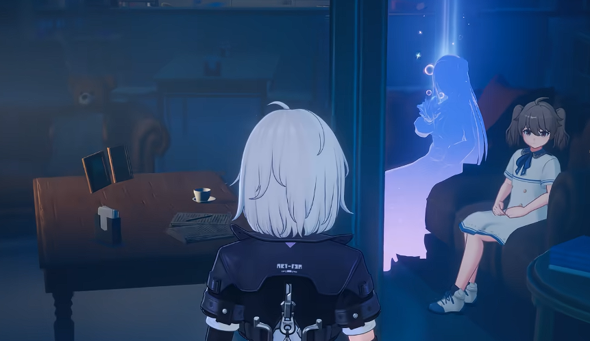 值得注意的是,影子所处位置被一扇紧闭的门完全阻隔。在异世界空间下该门不可开启;必须先切换至现实世界视角,门体结构才会变为可通行状态。进入屋内抵达影子所在坐标后,再次切回异世界空间,即可同时见到小女孩与黑色剪影,并触发关键对话,逐步揭示隐藏于两人之间的过往关联。