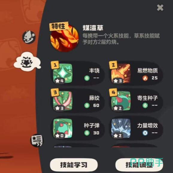 战斗中可优先使用草系技能叠加灼烧,再通过火系技能触发高额伤害,配合特性快速压低敌方血量。核心技能组合为易燃物质(魔法连击+灼烧叠加)+充分燃烧(灼烧立即生效)+藤缚(能量获取)+毒袭(中毒干扰)。战斗时先用易燃物质触发特性,单回合叠加4层灼烧,随后充分燃烧引爆伤害。面对高防御目标时,可穿插毒袭叠加中毒,形成双持续伤害压制。能量管理上,优先保证每3回合释放一次充分燃烧以维持输出节奏。