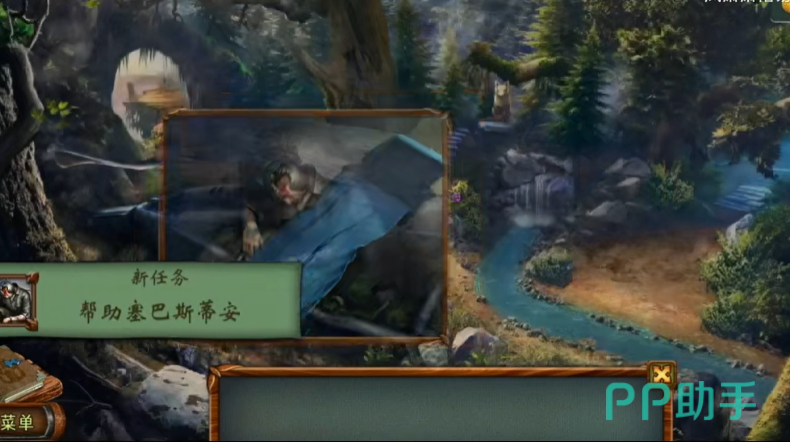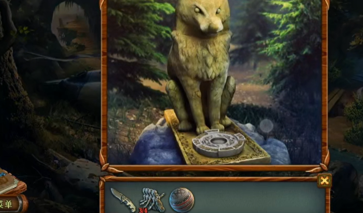 走左侧桥洞,用刀砍断左边的藤蔓,得到一块木板,点击右边路面的泥土堆,在旁边得到雕像,然后按下右边的一座老鹰雕像,在下面拿到雕像,点击右边路面的土丘,获得雕像,用木板修路,进入狼岛屿场景,点击狼雕像,就可以得到一颗石球。