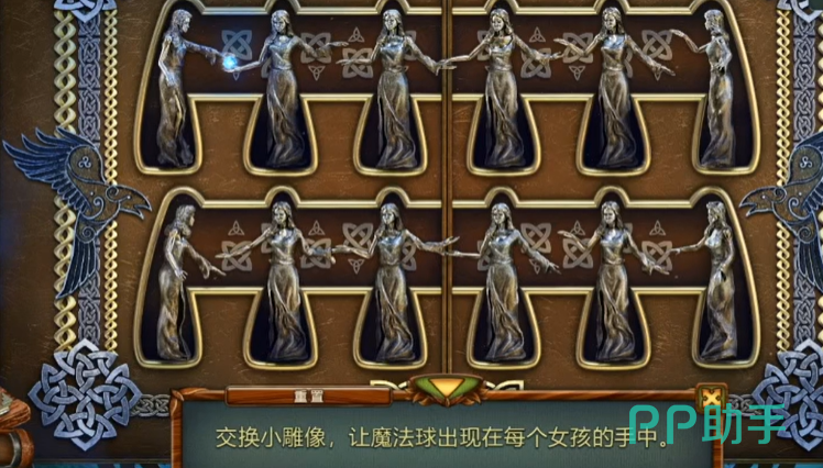 用雕像手里的石球去开后边中间的门,拿到了一条红宝石项链,将它放在了狼雕像下的凹槽,打开石板,就可以拿到最后一个雕像,按下中路通道尽头的大门,将四个雕塑放入其中,然后开始游戏:互换雕塑的位置,让每位雕像手里都有一个魔力球,完成后就打开中心岛场景。