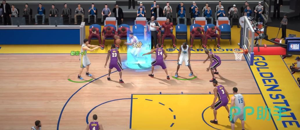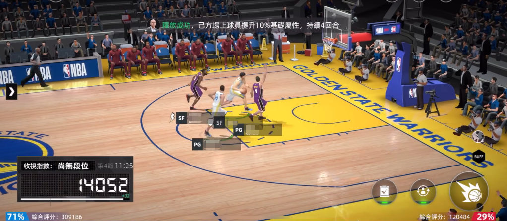 技能方面,“飞天遁地”是其核心进攻手段之一。释放后下一次出手必定为上篮动作,并激活“上篮提升”效果,不仅大幅提高成功率,还能降低对手的防守属性。结合其卓越的突破能力,非常适合用于快速切入内线制造杀伤,尤其在快攻反击场景下展现出极高的战术价值和得分效率。