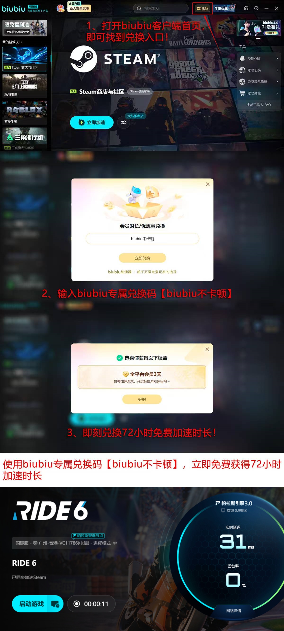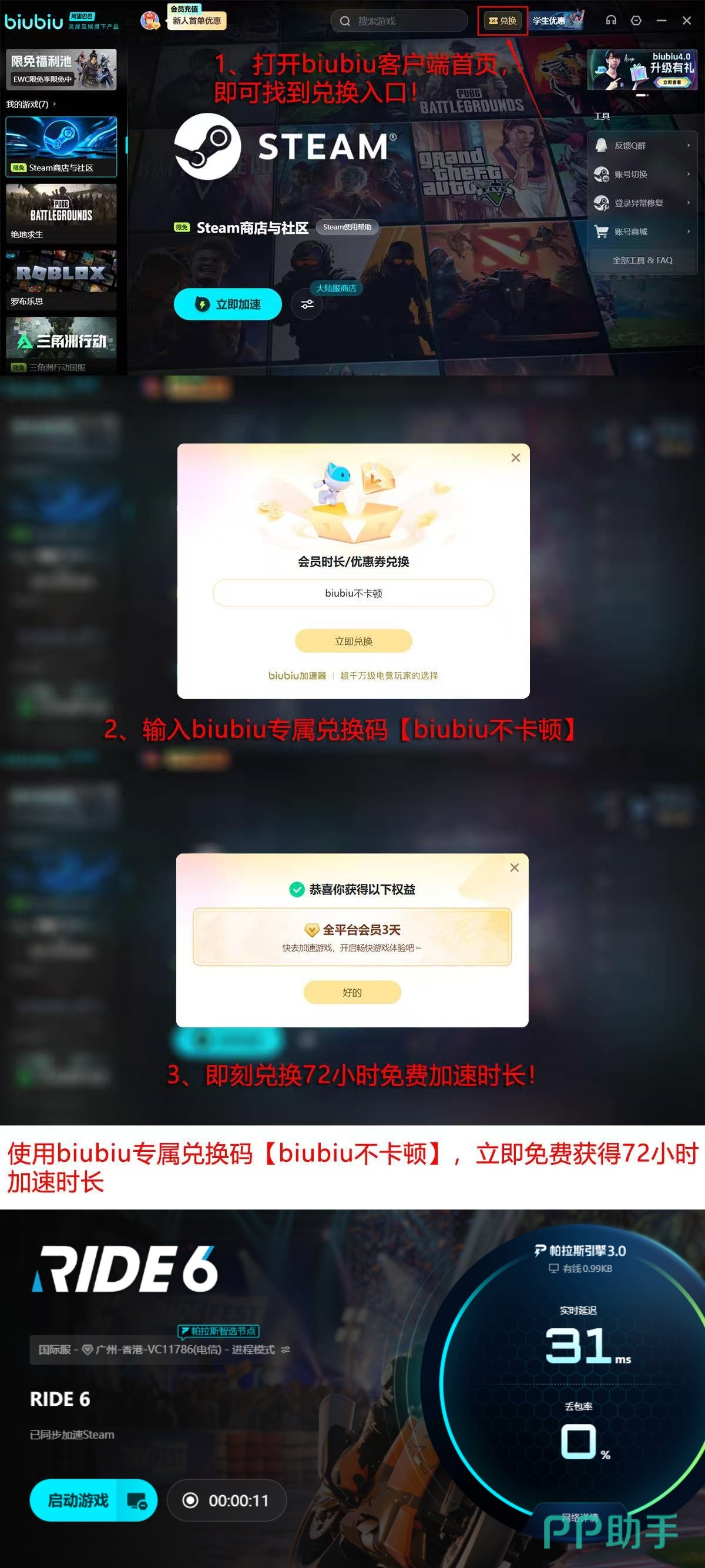 该工具搭载3.0帕拉斯引擎,可智能识别并切换最优网络链路,主动规避高延迟节点,端到端响应控制在毫秒级,有效消除加载卡顿与联机掉帧现象。PUBG职业冠军选手左梓轩曾多次参与其高强度压力测试,并在日常训练中持续使用该加速方案,验证其稳定性与实战适配性。新用户注册即享24小时免费试用权益;所有用户输入专属兑换码“biubiu不卡顿”,还可额外获得3天加速时长。