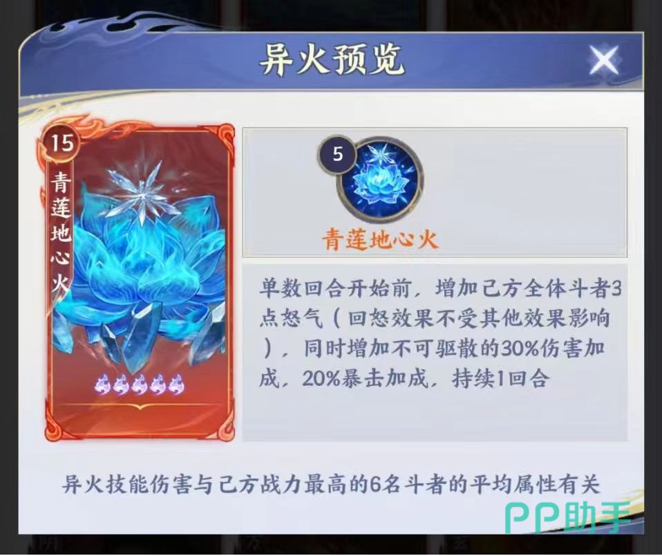 第三维度体现于高阶异火协同作战能力。特定异火组合达成后,可解锁百分比伤害增幅效果,进一步放大核心输出角色的实战效能。此外,每种异火均配备唯一战场技能:青莲地心火可在单数回合为全队成员恢复怒气值,加快斗技释放频率;海心炎于战斗初始阶段对敌方全体施加不可驱散标记,持续造成真实伤害;玄黄炎则具备随机爆发特性,制造不可预测的血线压制压力。