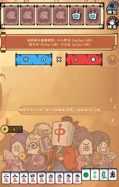 游戏核心玩法围绕“动态胡牌构建”展开:玩家需在每局中通过换牌、明牌、吃碰杠等操作,灵活调整手牌结构,最终达成指定番型并完成胡牌目标。单局通关条件为累计得分超过关卡设定阈值,策略路径高度自由——既可选择稳健流派,积小番稳扎稳打;亦可押注高风险高回报的大番组合,实现单局爆发式翻盘。