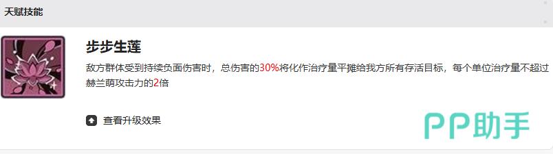 达到20级的时候使用顾盼生辉技能时,提升的觉醒效果使己方受到持续伤害额外减少5%,这相当于又给团队增加了一层护盾,降低了团队整体所受的伤害量,在面对以持续伤害为主的敌人时,这个技能的效果能够有效减缓团队血量下降的速度,到了25级步步生莲觉醒后治疗量提升至总伤害的60%,增强了该天赋的治疗效果,有了赫兰这一强大的转化能力,很多副本都有更多胜利几率了。
