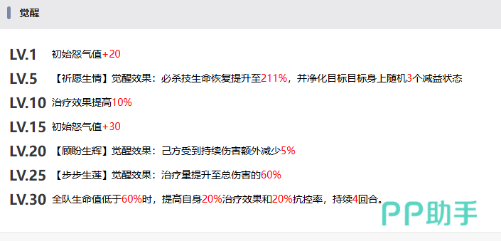 具体来看各个觉醒等级带来的变化还是很大的,觉醒只有一级的时候初始怒气值增加20点,这意味着赫兰能够更快地积攒满怒气释放必杀技,从而更频繁地为队友提供治疗和增益效果,在实际战斗中合理利用这一点可以先手带来节奏,到了5级的时候使用祈愿生情技能效果会更好,此时生命恢复量大幅提升至211%,这增强了团队的续航能力,同时还能净化目标身上随机3个减益状态,这一净化功能在应对控制型敌人或带有负面效果的技能时显得尤为重要。
