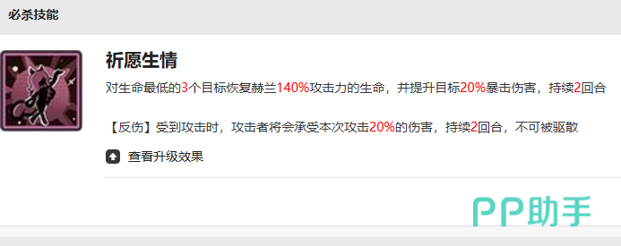 她的必杀技祈愿生情能够精准地锁定生命中最低的三个目标,为其恢复相当于自身140%攻击力的生命值,同时还能提升目标20%的暴击伤害,且这一增益效果可持续两回合之久,而独特的反伤机制是当赫兰受到攻击时,攻击者将承受本次攻击20%的伤害反馈,同样持续两回合,并且该效果无法被驱散,这让敌人在攻击她时不得不考虑这一点。