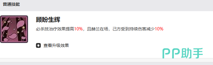 在普通攻击方面顾盼生辉也毫不逊色,此技能不仅能使必杀技的治疗效果提高10%,而且在赫兰在场的情况下,己方全体成员受到的持续伤害会减少10%,增强了团队的生存能力,被动技能摇曳生姿一旦触发,将为自身带来全方位的属性提升,包括生命上限提高15%、攻击力提高10%以及治疗效果提高10%,使得赫兰在战斗中的综合表现更加出色。