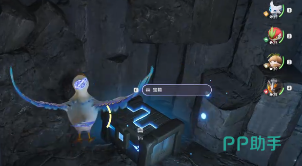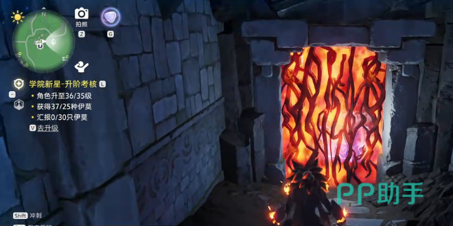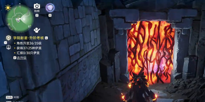 门前同样布满荆棘,需再次使用小炭犬的火焰技能将其烧毁。进入房间后,需完成能量收集任务:跟随漂浮的蓝色能量球依次触碰即可完成。随后将遭遇碎岩仔,并有机会采集土灵碎晶。部分宝箱位置隐蔽,有的藏于无光石壁旁,周围带有微弱蓝光特效,仔细观察方可发现。