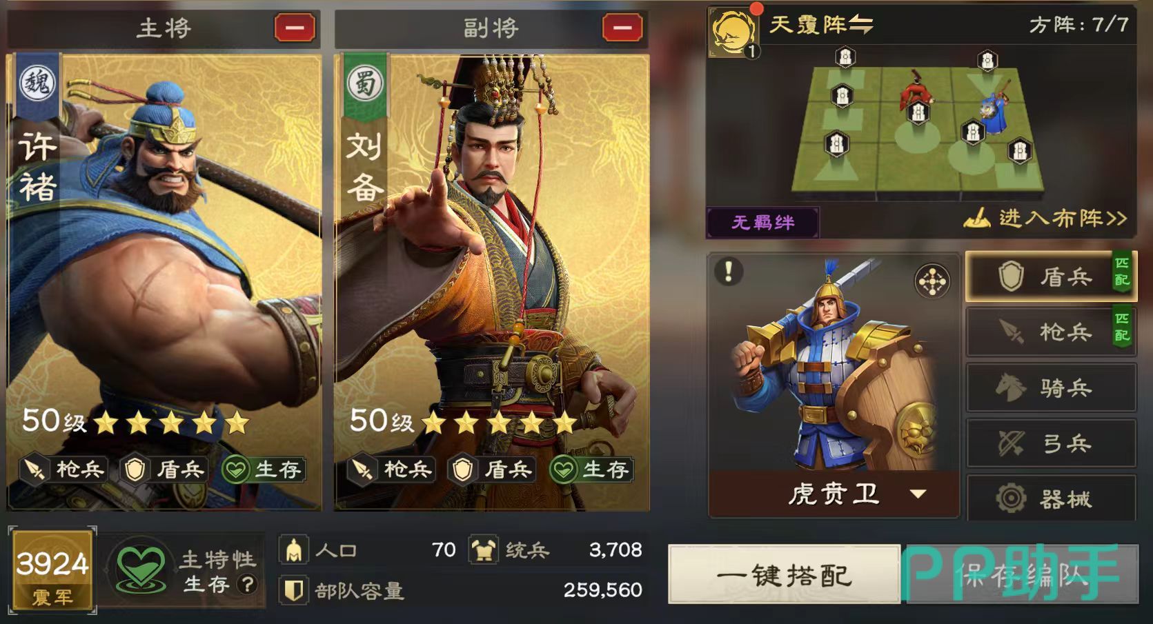 结合上述兵种特性与武将技能体系,玩家可以打造多样化的盾兵阵容。推荐第一种为“抗性生存流”,主将选用许褚,副将搭配刘备,兵种配置为虎贲卫,阵法选择天覆阵。该组合充分利用许褚提升抗性的技能机制,配合刘备降低暴击伤害的能力,大幅增强全队对普攻与技能暴击的抵抗能力,特别适用于对抗依赖爆发输出的敌方阵容,是赛季初期极具性价比的盾战组合。