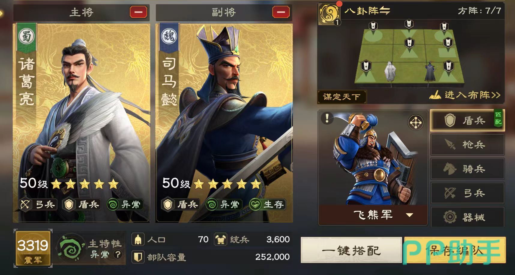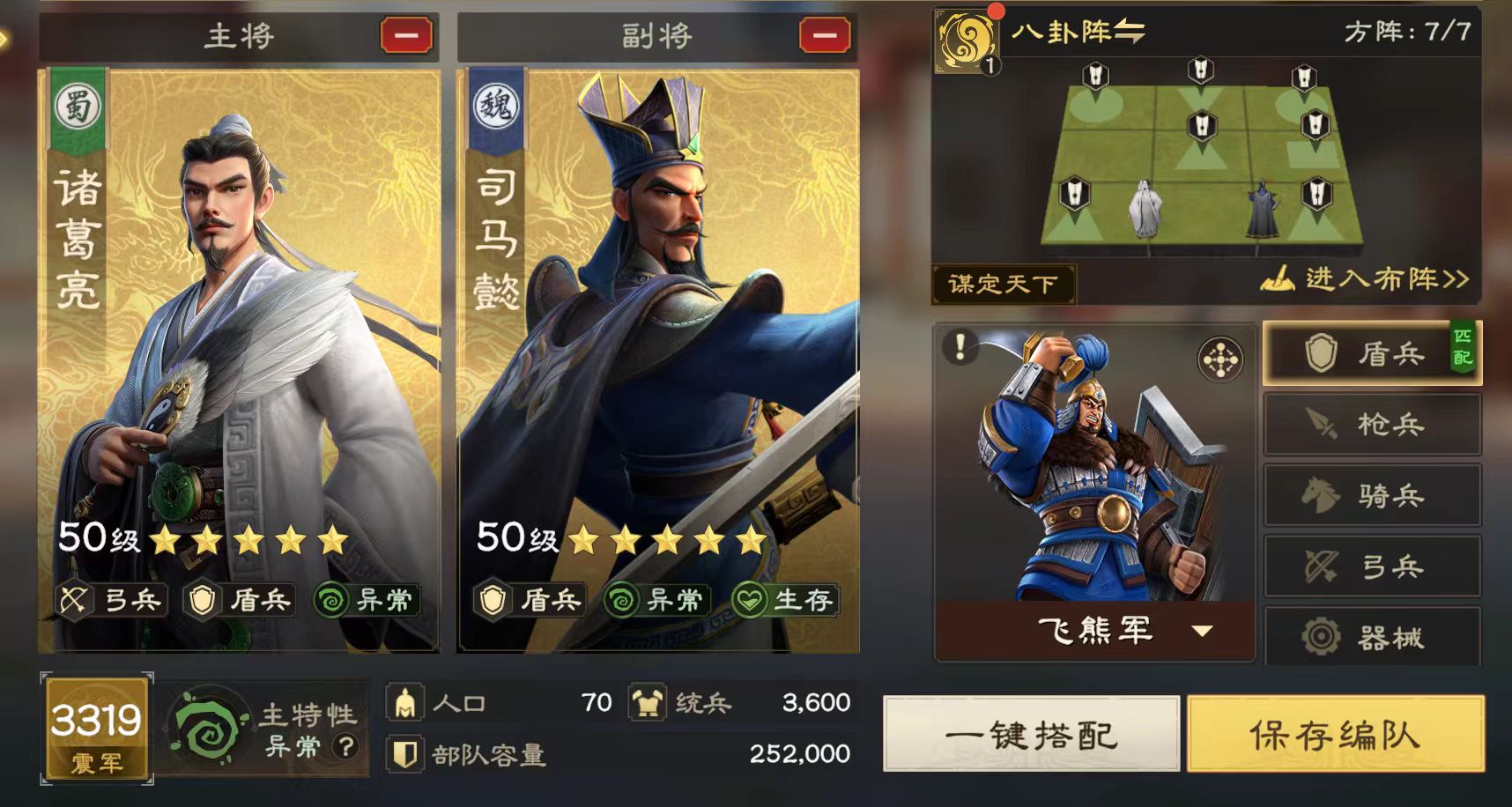 另一种强势流派为“异常状态压制型”盾兵队,代表阵容为诸葛亮与司马懿双智谋武将组合,兵种选用飞熊军,阵法可灵活切换为八卦阵或鱼鳞阵。此阵容激活专属羁绊后可显著提升异常状态造成的伤害。司马懿普攻附带中毒效果,诸葛亮被动则有机会施加灼烧状态,两人均具备高额谋略成长属性,通过持续叠加负面状态实现稳定输出。同时,二者皆拥有一定的回复能力,确保队伍续航充足,在战力相近的情况下几乎可应对所有主流阵容。