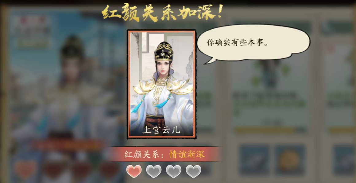 除战斗或策略类加成外,上官云儿的红颜属性亦能反哺门客能力成长,形成双向强化闭环。随着好感度提升,玩家还可解锁专属约会剧情与图鉴条目,进一步丰富角色认知维度。需要强调的是,该角色仅在第二章通关后开放获取,前期不可提前招募或培养。