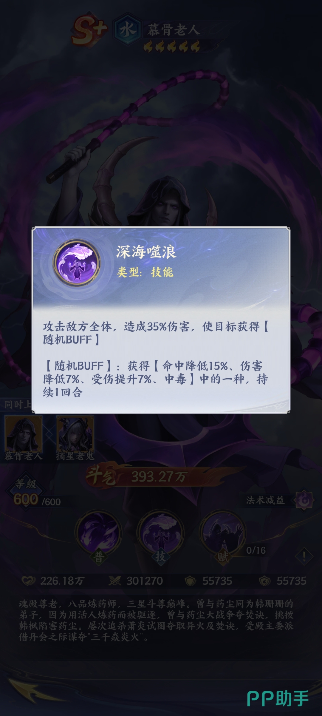 慕骨老人为水系S阶橙色品质角色,在当前版本中具备明确且不可替代的战术价值。其核心优势在于高覆盖率的硬控能力——技能可直接触发群体沉默与眩晕效果,打断敌方关键技能释放节奏。该特性使其在PVP竞技场、跨服擂台以及高难度世界Boss挑战中均表现出极强的功能性。尤其在需要限制敌方主C或治疗单位行动的场景下,慕骨老人往往能通过一次精准技能命中,显著缩短战斗时长,提升队伍整体容错率与斩杀效率。