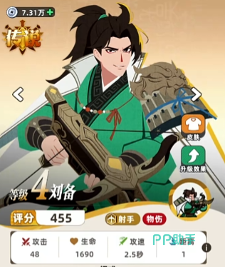 刘备技能对单体造成100%物理伤害,且有30%概率触发炸弹爆炸,对周围2格范围内的敌人造成溅射伤害;其天赋为光环类效果,为全体友军提供35%法术减免,强化团队法术抗性。