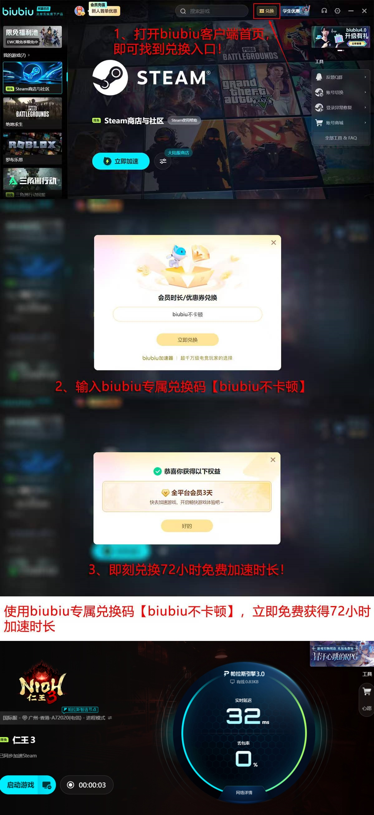 该技术方案已通过职业级验证,获PUBG明星冠军选手xdd公开认可并建立长期合作。除性能优势外,biubiu加速器同步提供实用用户权益:新注册用户可免费领取24小时加速时长;输入兑换码【biubiu不卡顿】还可额外激活72小时连续使用权限,合计达96小时无门槛体验。