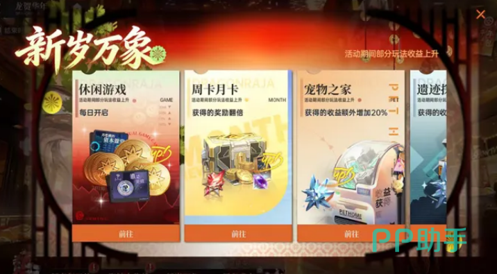 「新岁万象」为增益类常驻活动。活动期间,休闲小游戏每日开放,周卡与月卡基础奖励提升至双倍,同时部分常规玩法产出效率同步上调。该模块无需额外操作,玩家维持原有游戏习惯即可享受收益提升。