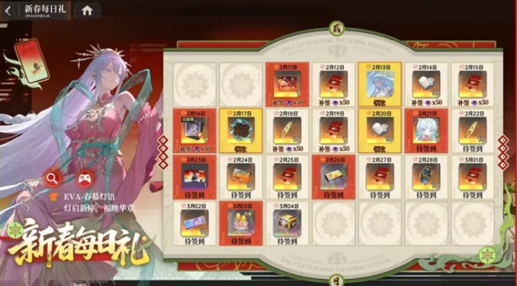 「新春每日礼」为连续登录奖励系统。活动期间每日首次登录即可领取对应奖励,包含限定伙伴EVA、皮肤「EVA-春幕灯语」、头像框「龙鳞祈岁」及EVA专属头像。此外,活动期内设有神秘伙伴来电彩蛋事件,具体角色信息暂未公开,需玩家自行触发验证。