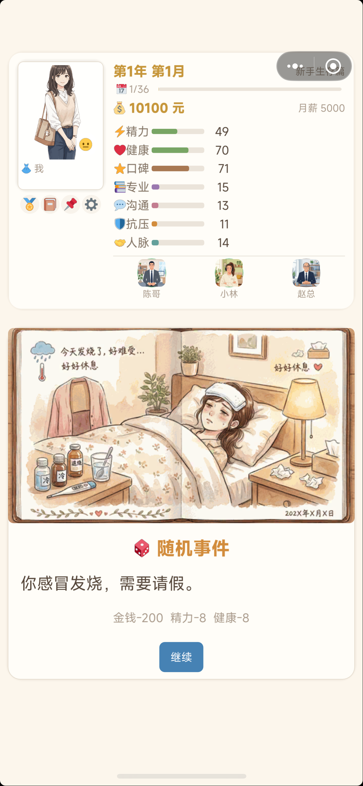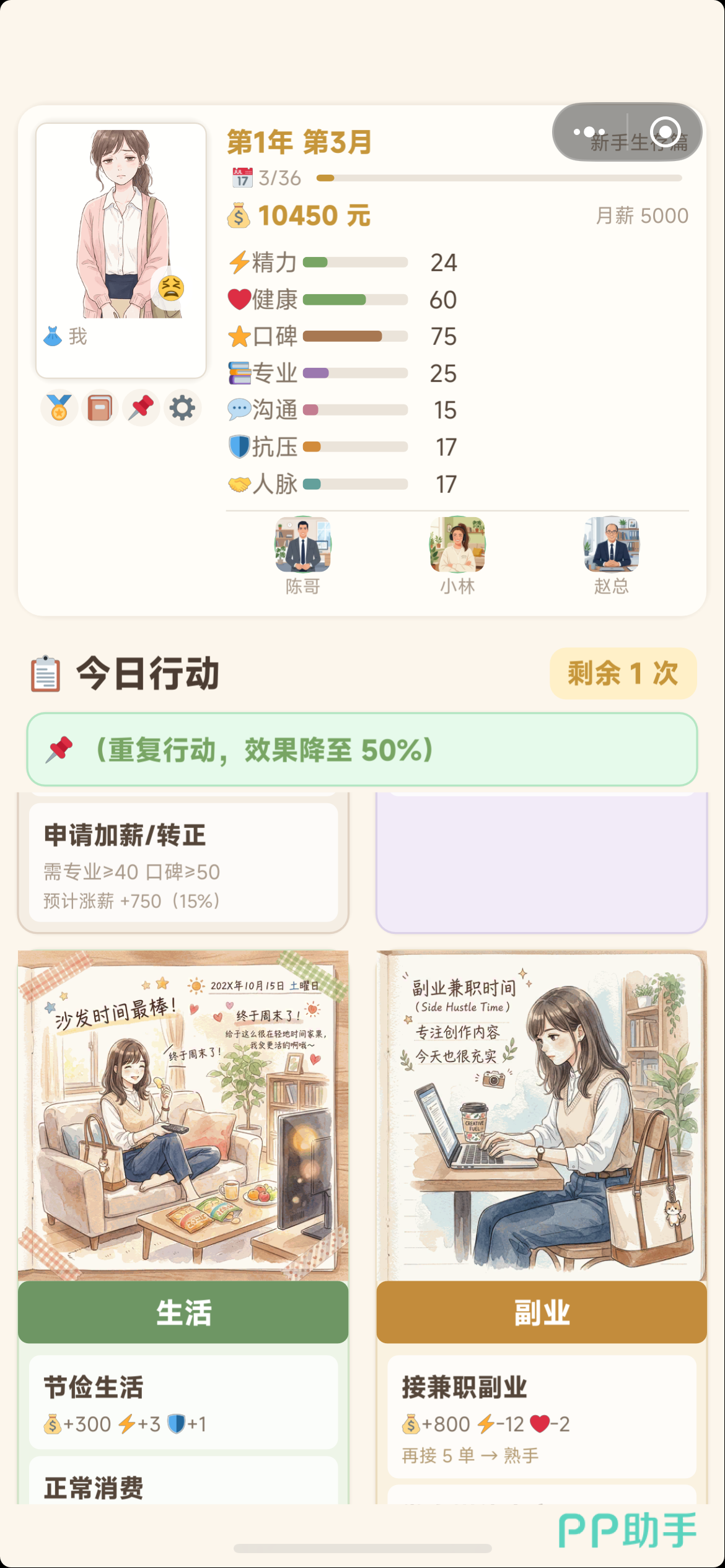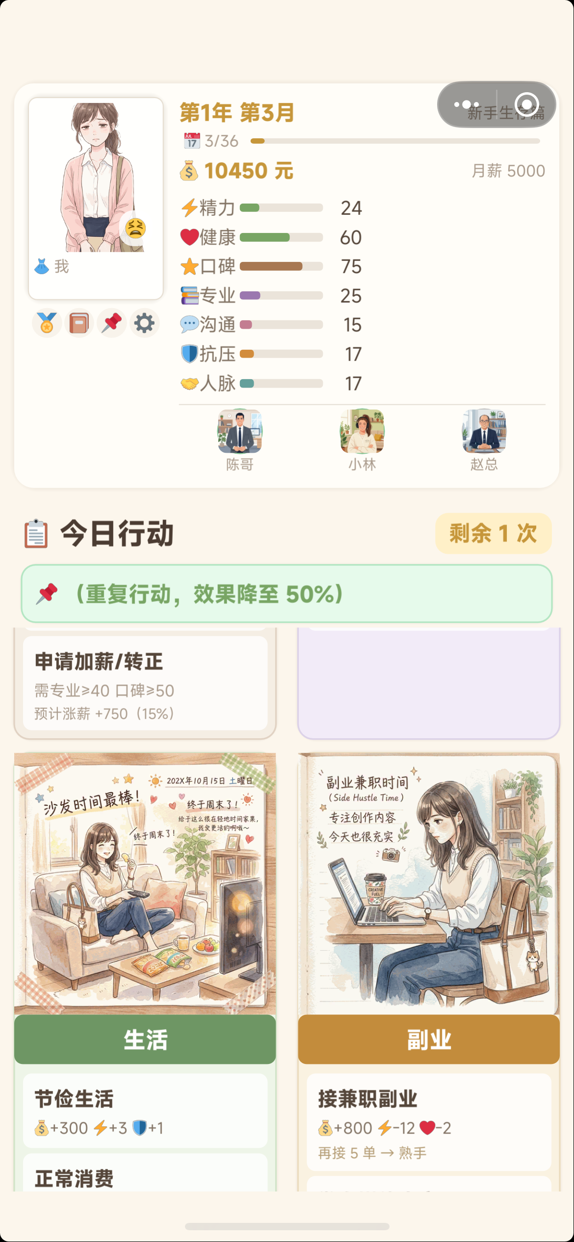 角色具备七维动态属性:精力、健康、口碑、专业、人脉、沟通、专业(注:原文中“专业”重复出现两次,此处严格保留原设定)。初始值中,精力、健康、口碑均为70点,其余四项起始为0。精力是核心调控变量:选择“专注工作”将快速提升专业能力,但单次消耗精力值较高;若精力跌破10点,将直接锁定多项行动选项。因此,合理规划工作节奏、穿插休息或生活类行为,是维持长期发展稳定性的基础逻辑。
