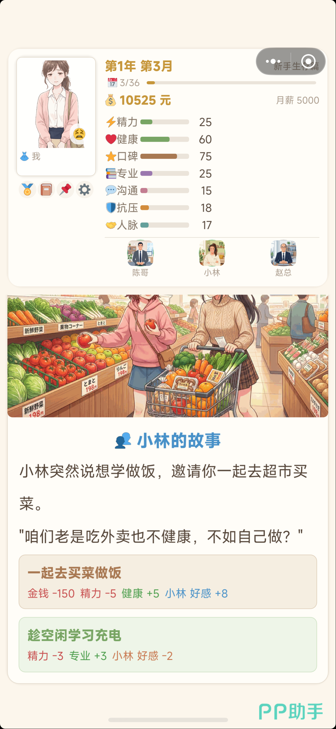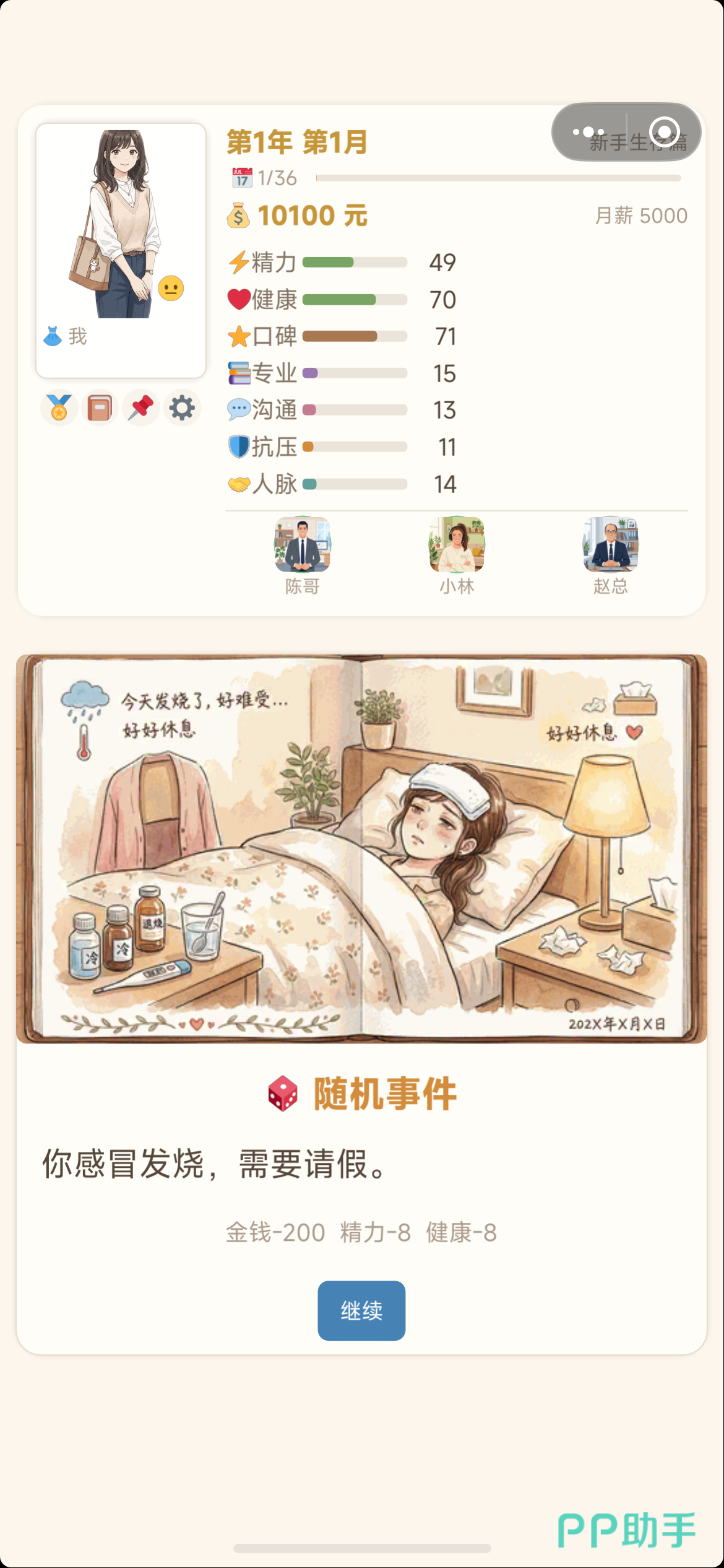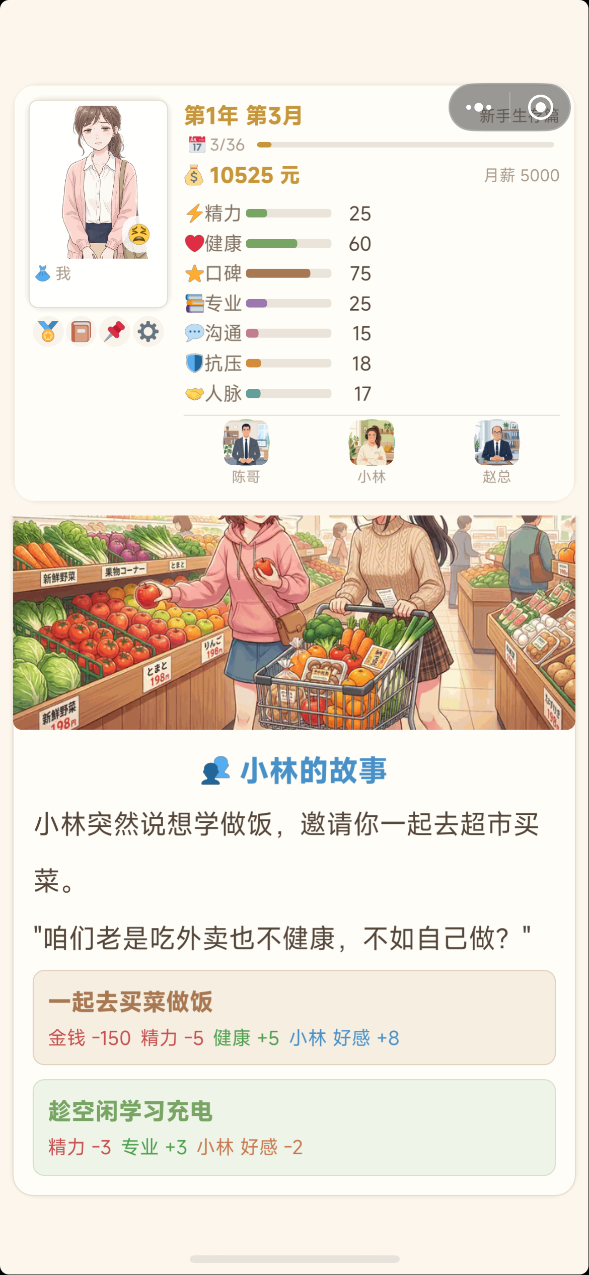 角色具备七维动态属性:精力、健康、口碑、专业、人脉、沟通、专业(注:原文中“专业”重复出现两次,此处严格保留原设定)。初始值中,精力、健康、口碑均为70点,其余四项起始为0。精力是核心调控变量:选择“专注工作”将快速提升专业能力,但单次消耗精力值较高;若精力跌破10点,将直接锁定多项行动选项。因此,合理规划工作节奏、穿插休息或生活类行为,是维持长期发展稳定性的基础逻辑。