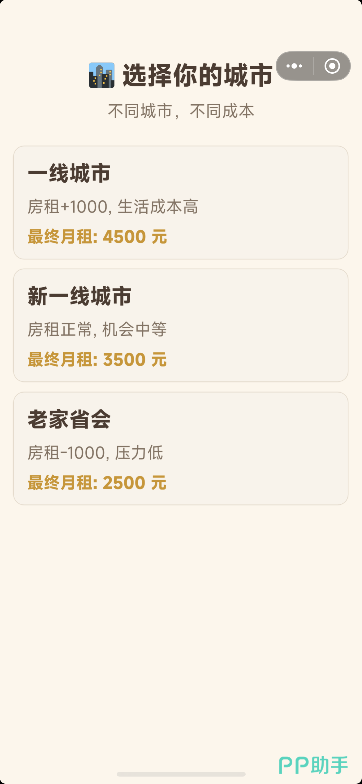 游戏采用极简文字界面,UI清爽无冗余,配色柔和,视觉负担低。开局提供三项关键自定义:角色性别、目标城市、入职公司。三者并非仅影响外观——不同城市的月均房租与生活成本存在显著差异;各公司开出的起薪、晋升节奏、加班强度也各不相同,直接影响后续资源分配策略。每位玩家拥有三次重开权限,系统自动保存当前进度;若选择覆盖存档,亦可一键清除,操作逻辑清晰直观。