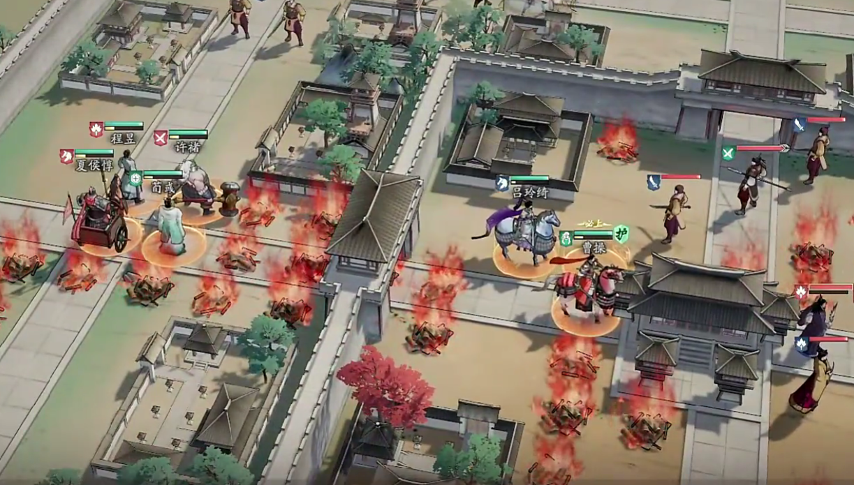 推荐阵容搭配为曹操、关羽、夏侯惇与吕玲绮。布阵时应确保各武将之间保持适当距离,防止被敌方AOE技能同时命中。曹操本人应置于相对安全的侧翼或后方边缘区域,保障其生存能力。