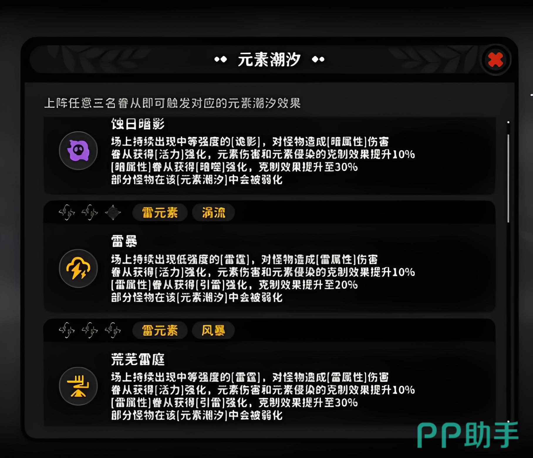 在实际战斗中,元素潮汐并非即时可用,需通过战斗积累能量条进行充能。界面顶部设有专属进度条,通常每30秒左右可释放一次。除了触发潮汐技能外,元素叠加还影响“浸染力”的累积。浸染力达到阈值后将触发“破韧”状态,使目标失去部分防御能力,此时玩家造成的伤害将转为更高效率的实体伤害,极大提升斩杀效率。