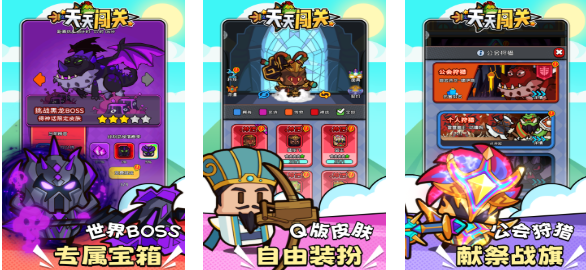 天天闯关是款玩法很容易的放置类竖屏闯关作品,放置挂机与世界BOSS战斗即可获取专属奖励,公会狩猎、聚餐等交互性玩法也很有创意,各种萌系搞笑的萌版皮肤亦可随意搭配,以放置方式来打怪闯关的玩法自由度极高,放置各种战士自动战斗完成任务相当简单,荒诞魔幻的世界背景也拥有不错代入感。