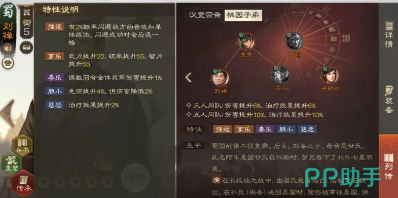刘禅的特性“强运”和“享乐”赋予了他与众不同的优势。“强运”让他拥有一定概率避开敌人的致命攻击,而“享乐”则显著提升了他的武力、统率和智力,全面增强了他的战斗力。得益于这两大特性,刘禅的各项属性提升后变得十分均衡,他不仅能够在前线扛住压力,还能通过增强智力和统率有效支援后方队友。