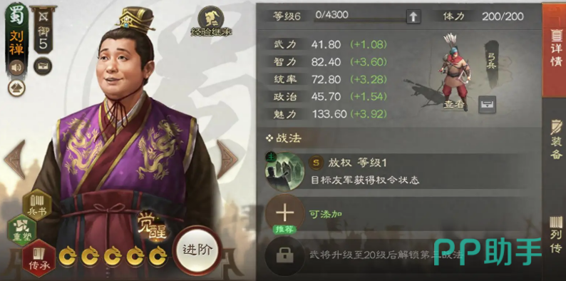 综合来看,刘禅是一位非常独特的辅助型武将。他的核心技能“放权”使得队友能够在关键时刻多次行动,从而快速打击敌人,制造更大的战斗优势。尽管其传承技能的效果存在一定局限,但在特定的阵容中仍然能发挥出强大的干扰作用。刘禅的整体强度适合那些喜欢利用战术调配、掌控节奏的玩家。他并不依赖自身输出,而是通过辅助队友来创造致命的攻击时机。因此,如果你在游戏中偏好策略型玩法,刘禅会是一个值得尝试的角色。