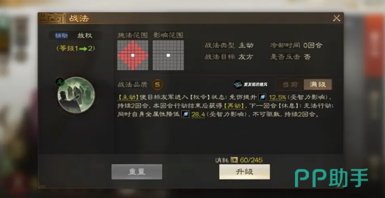 刘禅的核心战法是“放权”,这一技能可以让指定的队友进入“权令”状态。在这个状态下,目标队友将获得基于智力加成的免伤效果,持续两回合。而在行动结束后,队友还将获得一次“再动”的机会,可以再次行动。然而,随之而来的惩罚是该队友在下回合将无法行动,进入休息状态。此外,刘禅自身的所有属性会在两回合内下降。虽然这个惩罚似乎不小,但刘禅的这一技能最大的亮点就在于能够迅速提升队友的生存能力并为队友创造更多的输出机会,尤其是在关键回合能够实现多次行动,从而达到快速打击的效果。