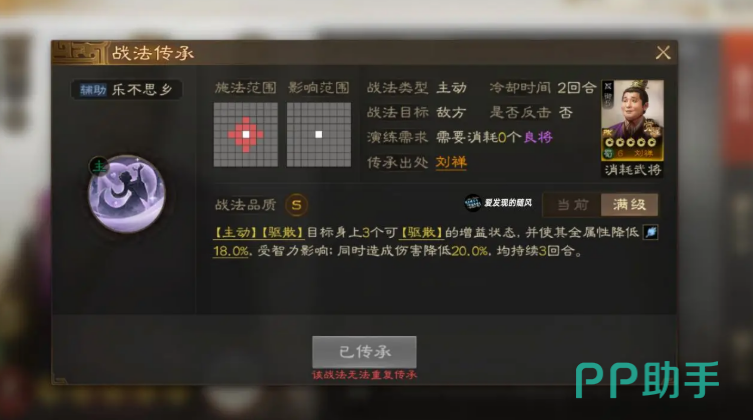 刘禅的传承技能“乐不思乡”则着重于干扰敌方。通过驱散敌方身上的三个增益状态,刘禅能使敌人的全属性下降,并降低其造成的伤害,持续三回合。虽然这一技能能够有效削弱敌人的战力,但其局限性也很明显:首先,技能效果可以被敌人驱散,其次,敌人身上可能并没有很多增益状态需要驱散。因此,这项技能的实际效果在不同的战局中会有所波动。