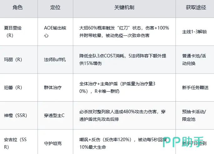 新手期玩家开荒可以使用的阵容分为高配阵容和低配阵容,高配阵容就是SSR卡牌和SR卡排混合搭配,因为SSR卡牌可能前期获取难度比较高,建议使用SR卡牌替代,目前最好用的一套高配阵容就是夏目里绘+玛丽+珀蕾+安吉拉+神橙了。
