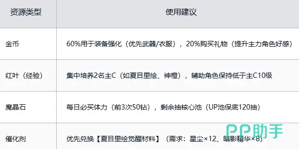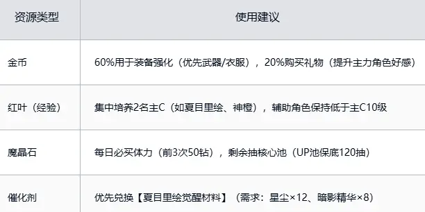 经验的话,建议优先去培养主C英雄,建议培养夏目里绘和神橙,魔晶石主要用来购买体力,剩下的就在核心池中抽卡,催化剂先兑换夏目里绘的觉醒材料。