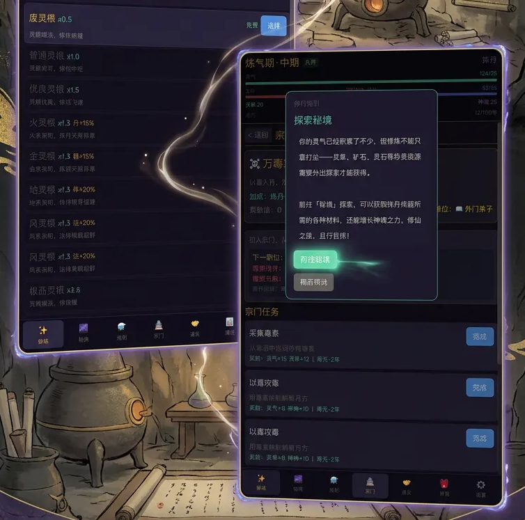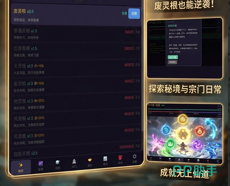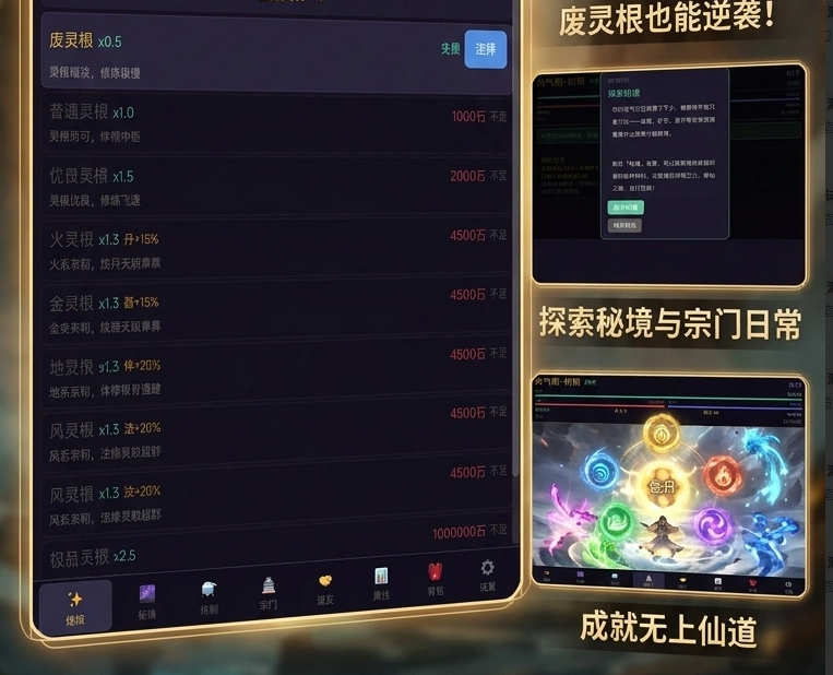 游戏核心成长体系围绕“灵根进化”展开:初始为废灵根,随主线推进与资源积累,可依次激活普通灵根、优质灵根,最终达成极品灵根资质。该设定强化了角色养成深度,赋予玩家持续进阶的明确目标与正向反馈。