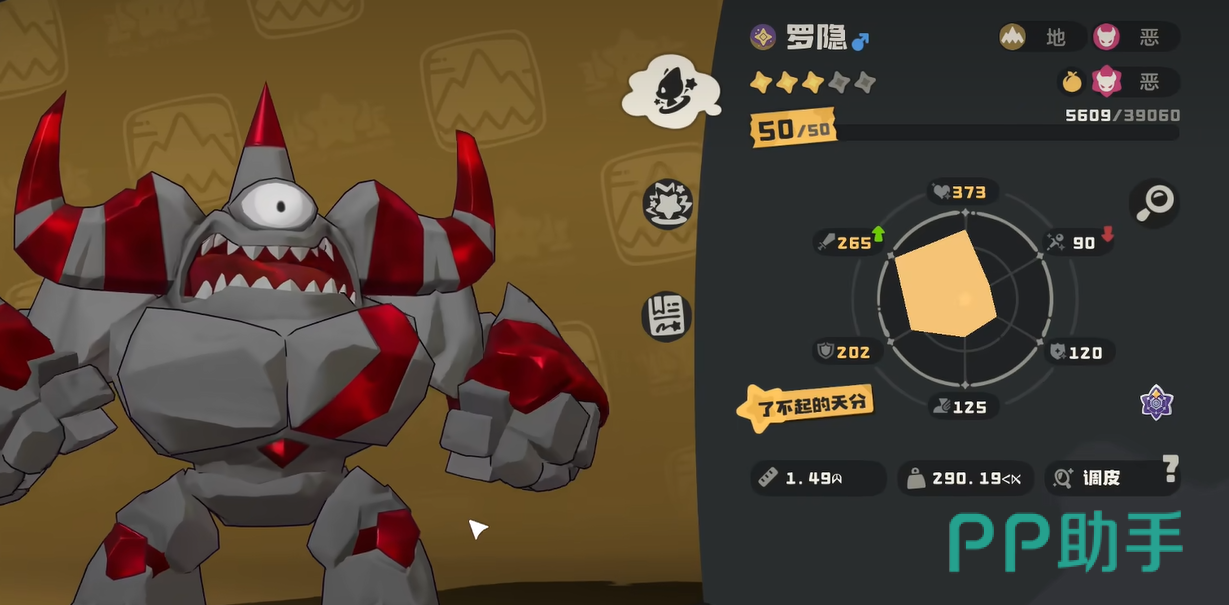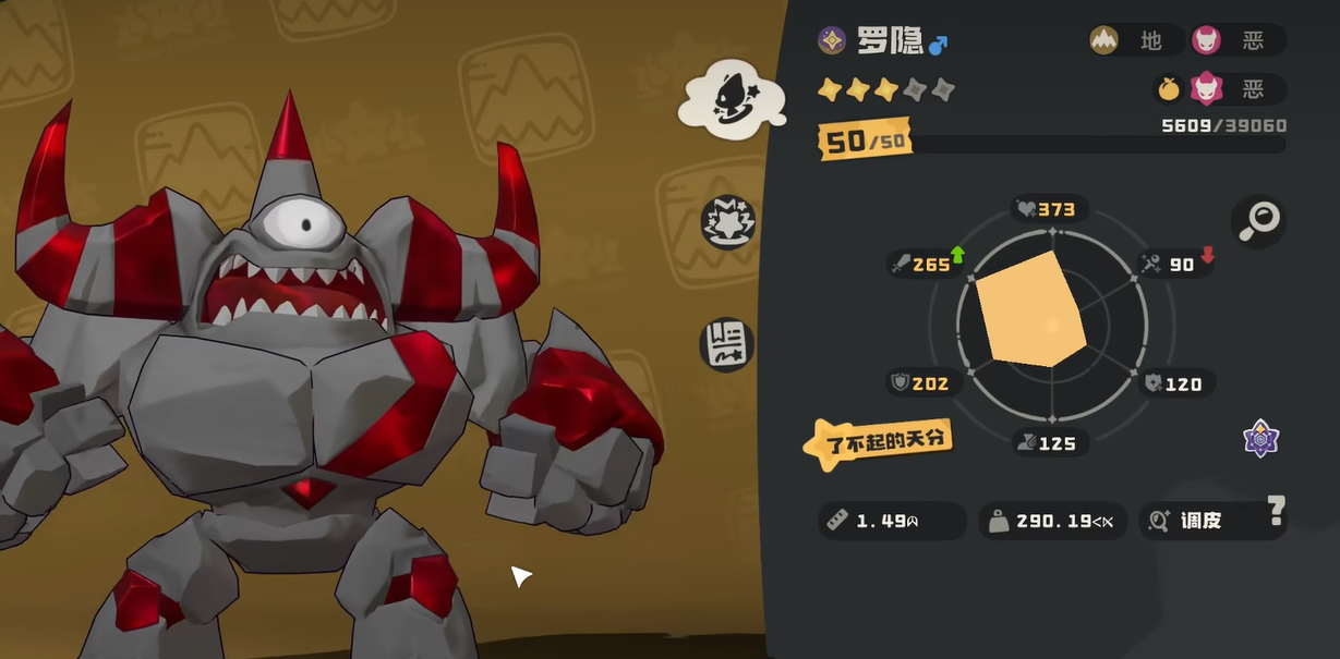 从基础数值来看,罗隐的总种族值为619,在当前版本所有精灵中处于顶尖梯队。其中物理攻击属性尤为突出,是其核心输出能力的根基;生命值设定兼顾生存需求,使其具备一定承伤能力,避免陷入即死风险;速度属性维持在中等偏上水平,足以支撑常规战术节奏;而双防(防御与特防)则相对均衡,符合其主攻定位,并未过度堆叠生存向数值。