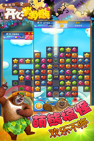 这款游戏的玩法仍然是,大家所熟悉的消消乐的形式,只不过是在这款游戏中的主题是,大家喜欢的动漫人物熊大、熊二和光头强等。游戏采用关卡的形式,如果能够顺利的通过更多的关卡就能够获得奖励。所以大家在进行消除的时候一定要眼疾手快。每一个关卡中的任务目标是不一样的,大家可以尽可能的获得高分。