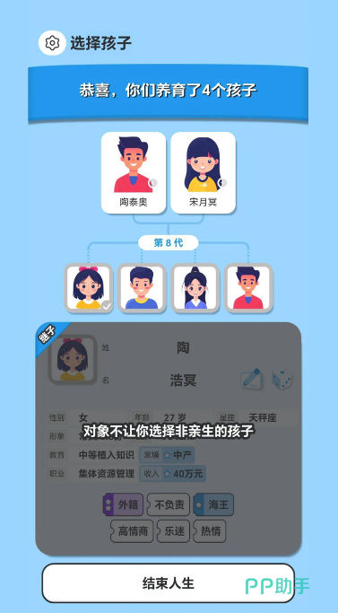由于在游戏内玩家们将会不停的传宗接代,因此在获得了下一代之后,小伙伴们也需要为自己的下一代精心挑选合适的伴侣,尽可能的使自己的家族一直传承下去,如果说在某一代之后你未能获得合适的伴侣,这也就意味着游戏结束了,因此小伙伴们在游戏里一定要注意遗传哦。