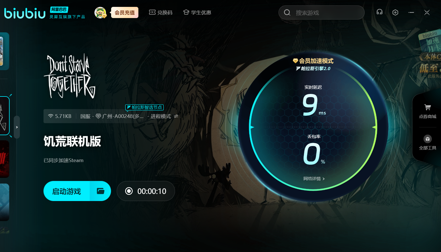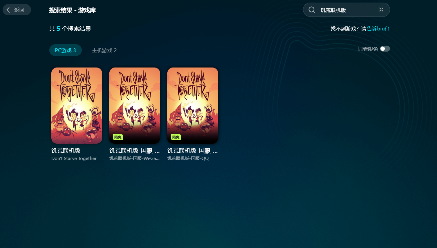 在登录之后,首页上方搜“饥荒联机版”就能看到对应版本,目前国服还正处于限免活动期。为了让大家能更好地探索这个充满魅力的沙盒世界,biubiu为大家带来独享高速专网通道,节点遍布全球的选择丰富多样,并能依据网络状况智能匹配切换,大部分的大区都能满足。