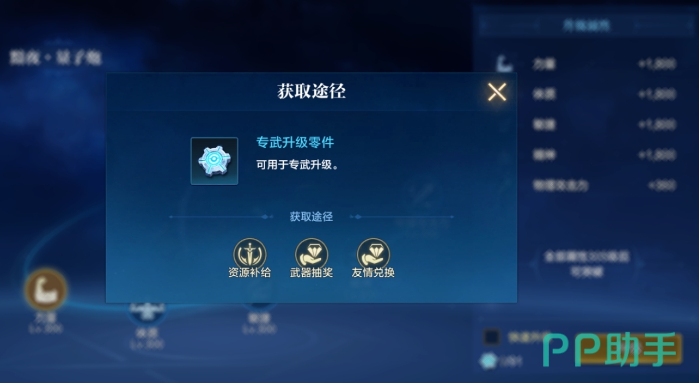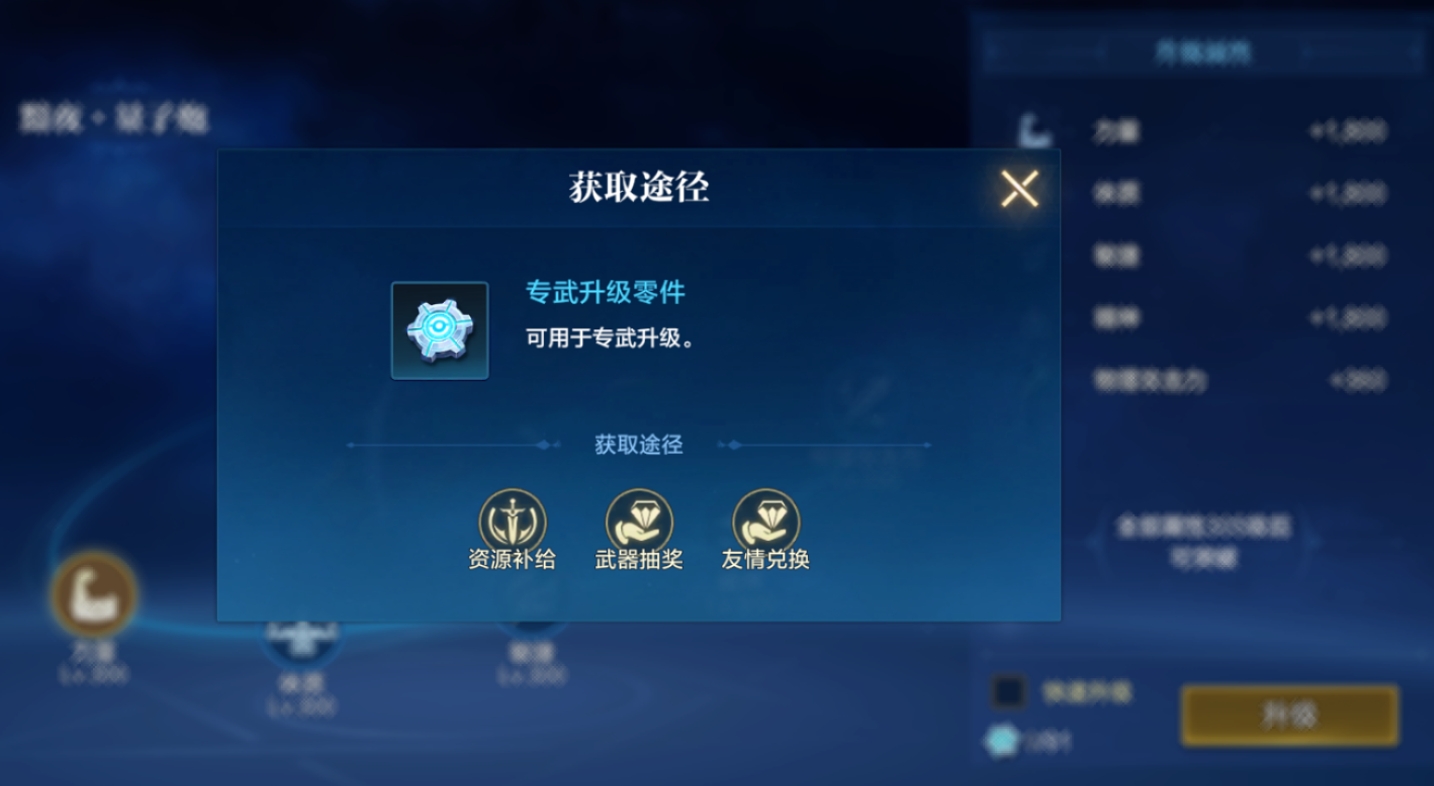 基础专武的强化依赖“专武升级零件”,该材料主要通过资源补给箱、友情商店兑换等常规途径稳定产出,用途唯一且无其他消耗场景,建议玩家在积累足量后立即投入升级,避免资源积压。升级规则为线性轮转制:需依次提升力量、敏捷、智力、体力四项属性,每项升一级后方可循环重置,再次从力量开始下一轮升级。当四项属性均达到指定等级阈值时,系统将开放“专武突破”功能,进一步拓展属性成长上限。