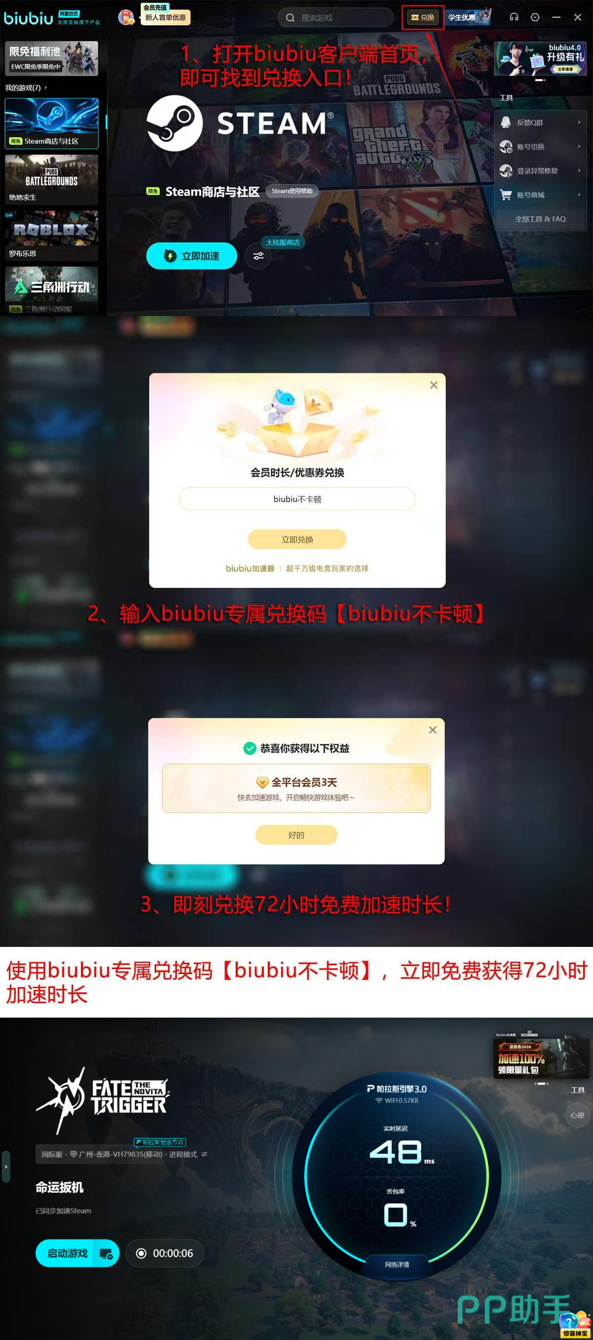 面向新用户,biubiu加速器推出专项入门支持方案:完成注册即可获赠24小时全功能试用权限;输入激活码【biubiu不卡顿】,可额外解锁72小时加速服务。总计96小时的无限制高速通道,助力玩家快速适应空岛战场节奏,规避因网络波动导致的操作延迟与帧率抖动问题。