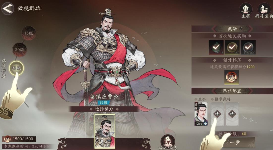 每次挑战最多可携带两名武将出战。接着将视线移至右侧区域,可查看当前匹配到的对手信息。对手设有不同等级段,难度随之递增,所有玩家必须从最低档位——15级开始逐层推进,按顺序完成每一阶段的任务目标。