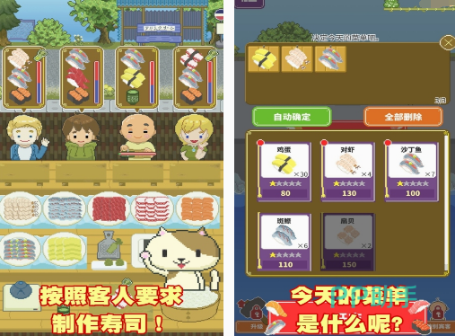 这款采用卡通风格所设置的寿司游戏。也将成为寿司店老板,由于客人口味不同,所以在给客人制作的过程中。也要根据需求完成定做。也是有超多关卡内容的。闯的关卡数量越多,证明自己在制作这方面更厉害。有着制作寿司时很多的食材需求,无论是生鱼片或者是各种米饭应有尽有,要进行合理的搭配,更能获得超高的收入。