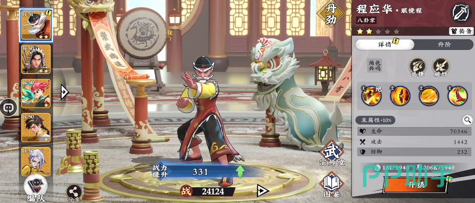 第二位推荐:程应华。作为八卦掌流派代表,其核心优势在于「攻防一体的循环续航」。通过羁绊「破竹」提升承伤能力,「迅捷」强化攻速与连招频率,绝招可发动11次连续掌击,每命中一次即恢复一定生命值。该回血机制虽单次数值有限,但因攻击频次高、覆盖范围广,在持续作战中形成稳定血线保障。尤其当其处于前排中央位置时,受击频率提升反而加速回血节奏,配合真实伤害特性,对高护甲目标亦具压制力。因此,程应华不仅胜任传统坦克职能,更可作为半输出型前排参与中期压制与后期收割。